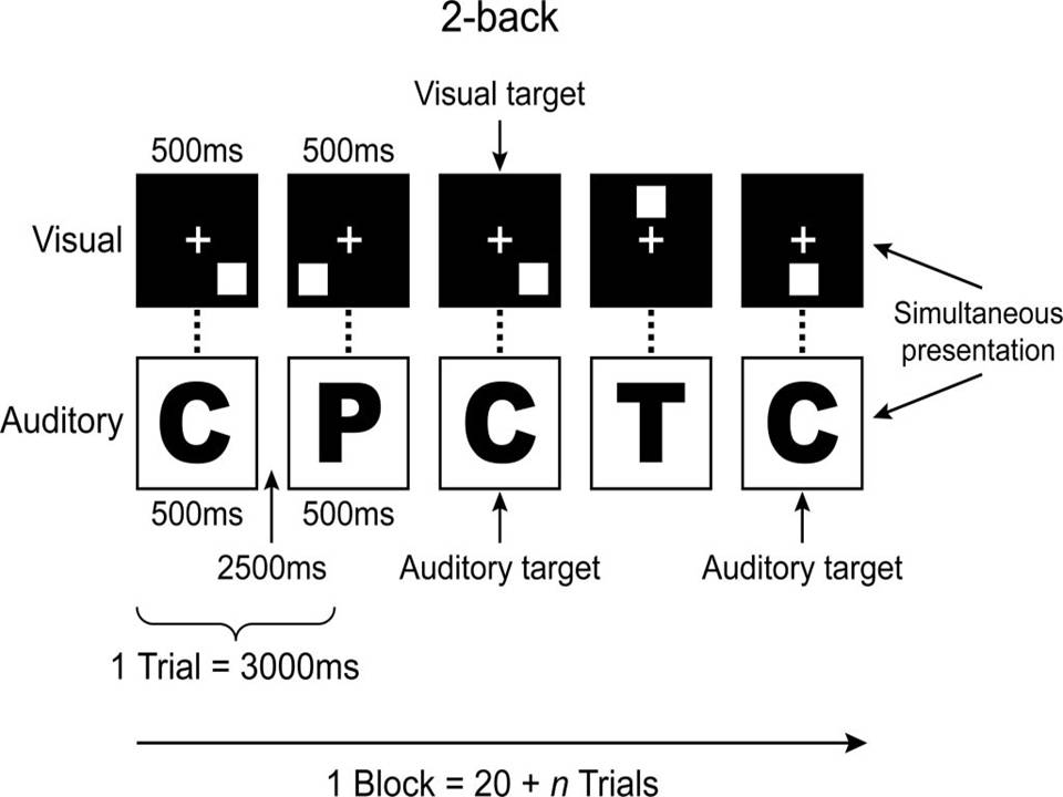 杰基等人在研究中所使用的训练任务,要求志愿者判断每一个出现的方块位置与此前呈现过的第n个方块的位置是否相同,或者判断每一个出现的字母与此前刚呈现过的第n个字母是否相同。图片来源:参考文献[3]