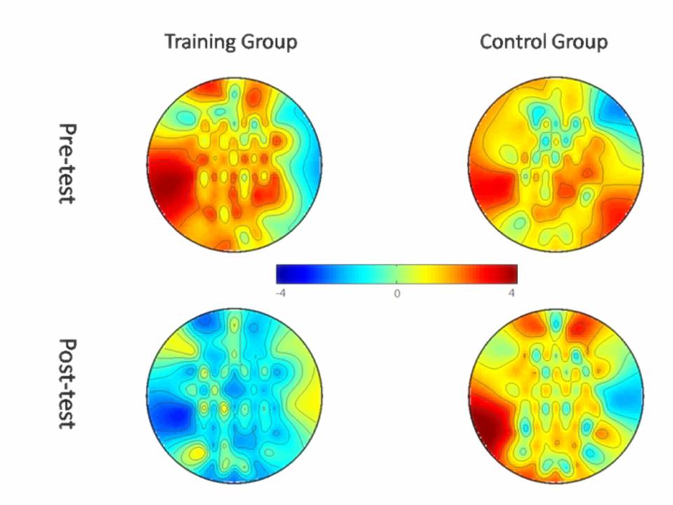 我们的研究发现,与控制组(Control Group)相比,经过20天的认知训练,训练组(Training Group)被试在完成认知任务时,大脑电流密度发生了变化,完成任务所要耗费的认知资源也发生了变化。图片来源:参考文献[15]