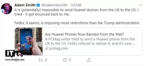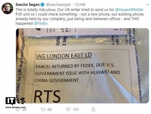 PCMag首席分析师Sascha Segan在推特上指责了联邦快递的这一行为。他写道:“这完全荒谬。我们的英国记者试图把华为P30手机发送给我们,这样我就可以进行一些验证——这不是一部新手机,而是我们已经拥有的手机,属于公司,只是在办公室之间传递——而(这个邮件)却在联邦快递却遭遇了这样的事情。”
