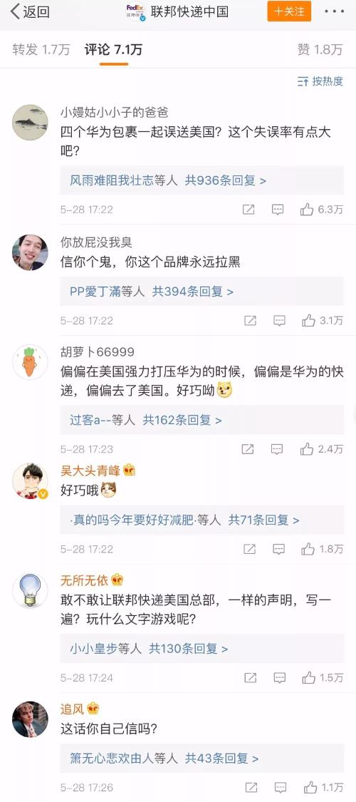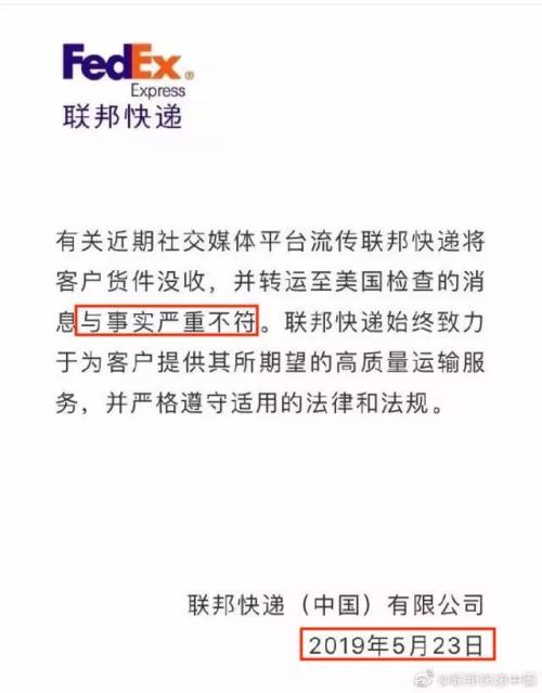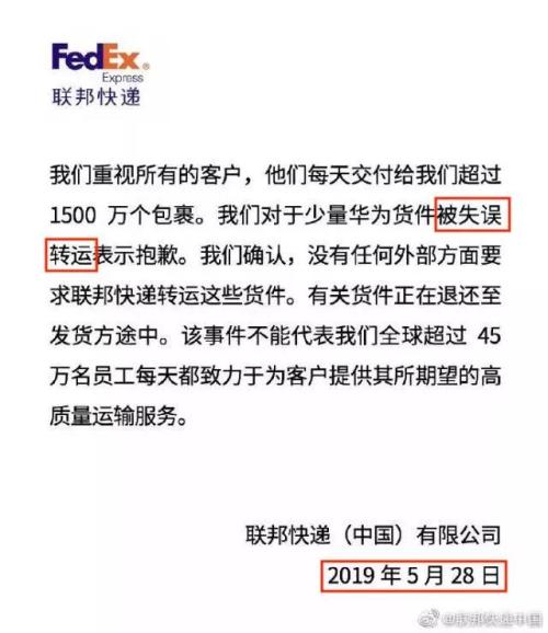 对于华为的包裹“离奇改道”,联邦快递中国5月23日在其官方微博回应称“假消息”……