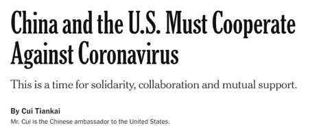 周日(4月5日),中国驻美大使崔天凯也曾投书到《纽约时报》,表明中美两国在防疫上曾经有过“不太愉快的对话”,但是现在已经是时后让双方“团结、合作、互相支援”。