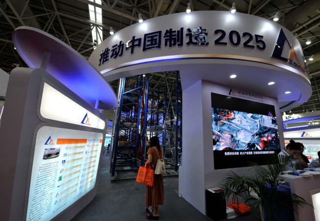北京推動的「中國製造2025」由政策轉成規畫。圖為一家科研機構兩年前在福州展示的推動「中國製造2025」展台。(中新社)