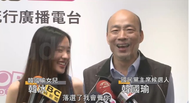 國民黨高市長候選人韓國瑜(右)的大女兒韓冰,曾在韓國瑜選國民黨主席的時候,上節目力挺老爸,魅力不輸老爸。(取材自YouTube)