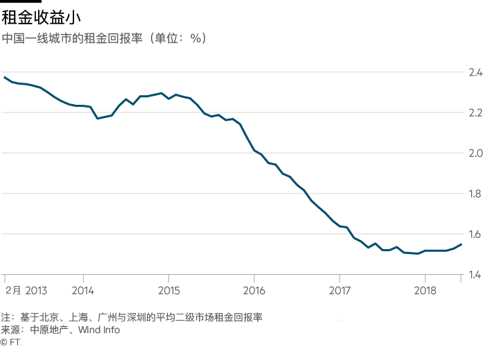 积极拿下多块自持住宅地块的的万科也面临同样的收益率问题。万科高级副总裁谭华杰在接受《界面》采访时说:“假如万科通过住宅用地拿地盖房子出租,租金回报率大概只有3%,如果加上税收20%,最终的租金收益率只有2.4%。目前没有任何一个企业能够做到2.4%的融资利率,所以看起来这根本不可行。”而中原地产的数据显示,随着房价的走高,中国的租金回报率从2016年开始就下滑到低于2%的水平(见下图)。长期以来,房价的增速远远高于租金的增速,因此压低了租金回报率。 机构为了获得合理的利润,只能大幅提高租金。