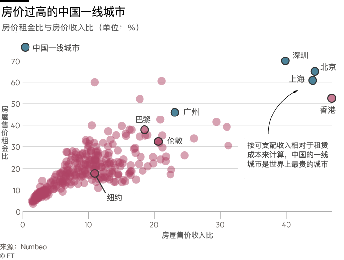 从全球的角度来看,在中国买房的性价比并不高。专注于研究各国生活成本及质量的机构Numbeo,最新的调研数据显示(见下图),中国一线城市在全球300个城市之中拥有最高的房屋售价租金比(用来判断某一区域房产是否存在价值泡沫的一个衡量指标),这意味着仅从租金的角度来看,租房远远比买房划算。但是站在中国购房者的角度,这笔账不是这么算的。在中国,户口、教育都与房屋的所有权紧密挂钩。尽管各个地方政府都在租售同权上有一些改善,但在优质教育资源仍非常稀缺的大背景下,商品房的所有权依然是优先享有入学资格的先决条件。