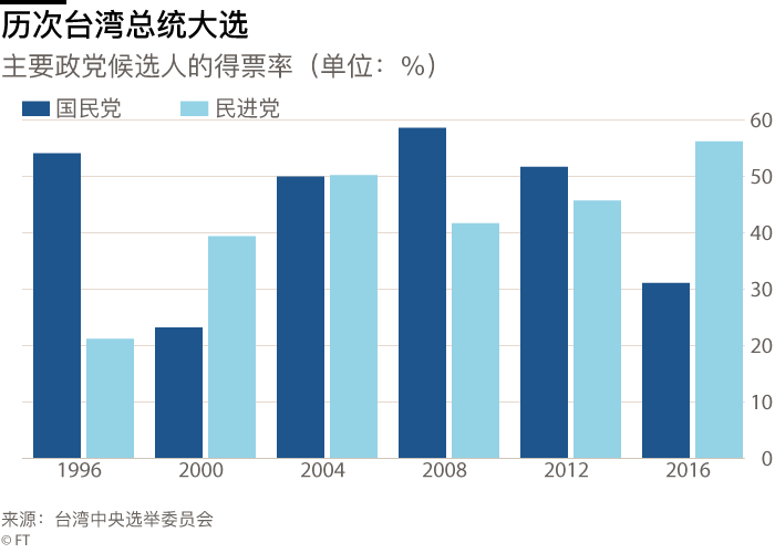 上世纪40年代,国民党在蒋介石(Chiang Kai-shek)领导下从中国大陆逃到台湾,实施了长达数十年的戒严,直到上世纪80年代末开启民主化进程。尽管台湾和中国大陆之间的军事紧张局面一直存在,但2008年至2016年,在前总统马英九(Ma Ying-jeou)任内,国民党推动两岸加强经济联系。
