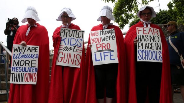 图片版权REUTERSImage caption身穿电视剧中人物的示威者,举着的牌子从左至右:“为什么对子宫的管控比枪支更严(指反堕胎)”、“该保护的是孩子,不是枪支”、“还以为你们支持保护生命”、“校园里不该有恐惧”图片版权REUTERS图片版权REUTERSImage caption要保护的是孩子,不是枪支