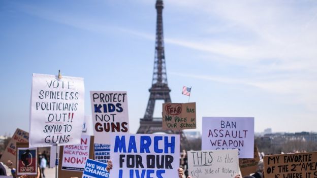 图片版权GETTY IMAGESImage caption德国柏林民众示威声援美国反枪支大游行法国巴黎图片版权EPAImage caption法国巴黎声援华盛顿“为我们的生命大游行”,一名妇女高举“要保护的是孩子,不是枪支”的标语牌。