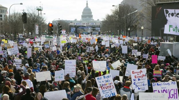 图片版权GETTY IMAGESImage caption华盛顿“为我们的生命游行”,示威者的标语上写着“胳膊是用来拥抱的”、“学校是学习场所,不能封锁”、”给教师配笔,不是枪“等口号。图片版权REUTERSImage caption据估计多达50万人参加3月24日华盛顿的 “为我们的生命大游行”