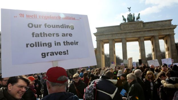 图片版权REUTERSImage caption纽约民众举以往校园枪击案受害师生的肖像和生平介绍参加“为我们的生命游行”活动德国柏林