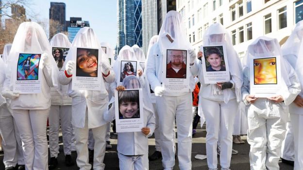 图片版权REUTERSImage caption纽约民众举以往校园枪击案受害师生的肖像和生平介绍参加“为我们的生命游行”活动英国伦敦