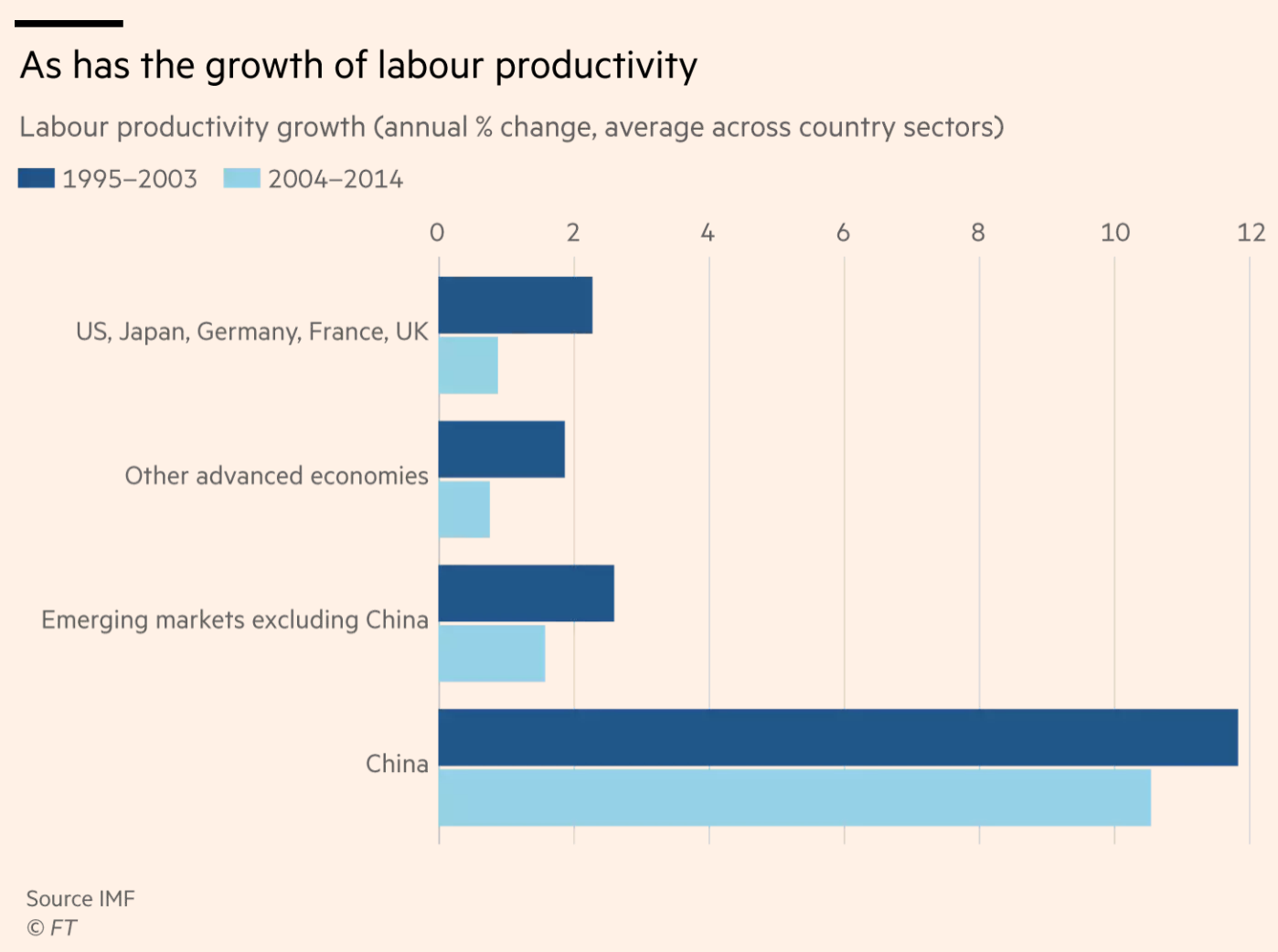 人们可能会希望,获取外国知识还能提高生产率。可想而知,这种作用对新兴经济体尤其重要。但可惜的是,自2004年以来几乎各地的劳动生产率增速都在放缓,其原因可能是全球金融危机。