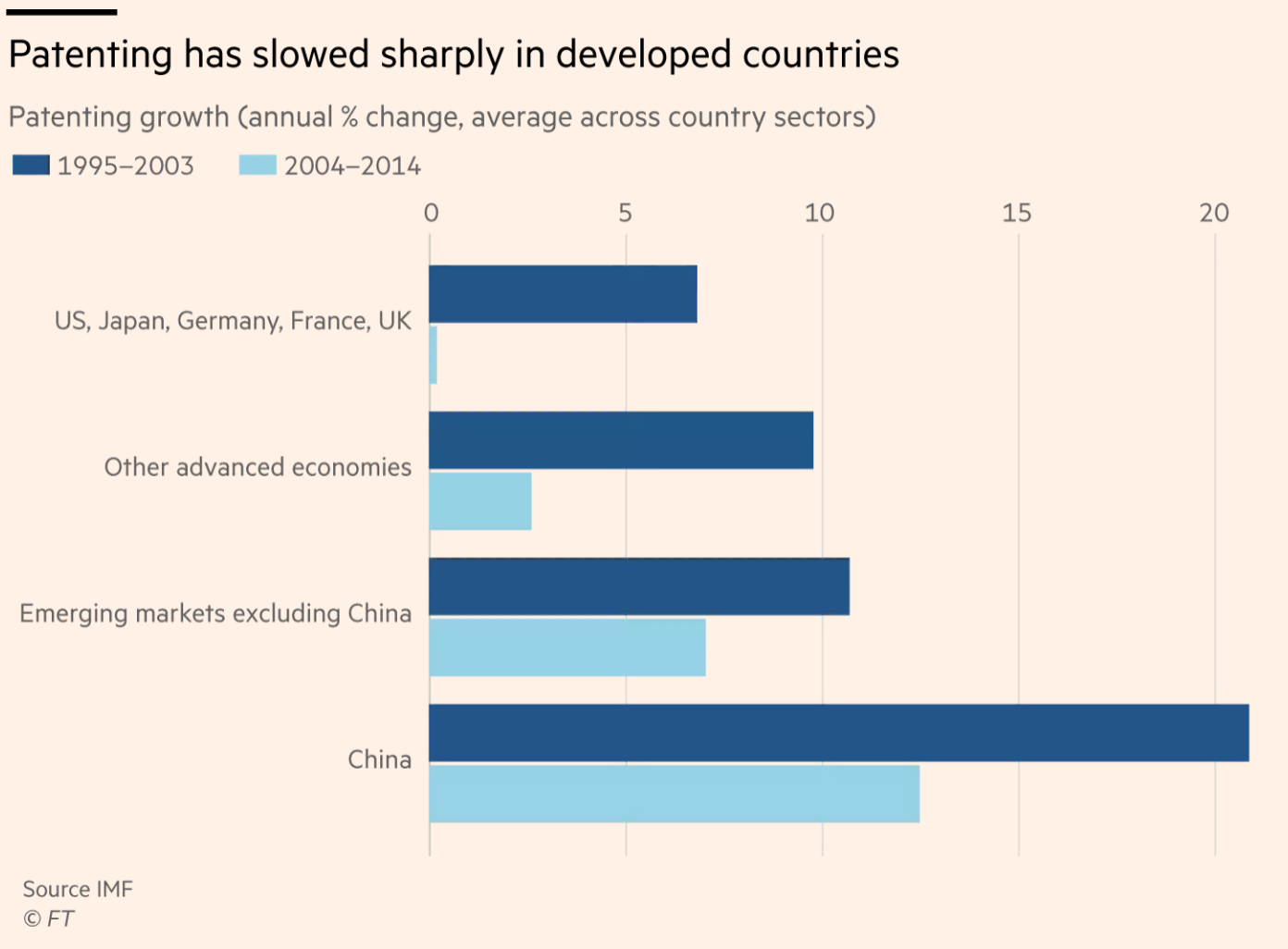 其中最有意义的结论也许是创新地点的改变。如果以所谓的“专利族”(patent family)——即在一个以上辖区提交的专利申请,反映了该专利的重要程度——来衡量这一点,美国、日本和欧洲三大经济体(德国、法国和英国)仍然占主导地位。中国在研发支出方面已经位居第二,仅略低于美国。专利总量上中国也已领先英国。引人注目的是,五大发达经济体的专利申请年增长率已陷入停滞,而新兴世界,尤其是中国的专利申请量却在快速增长。(见图表)