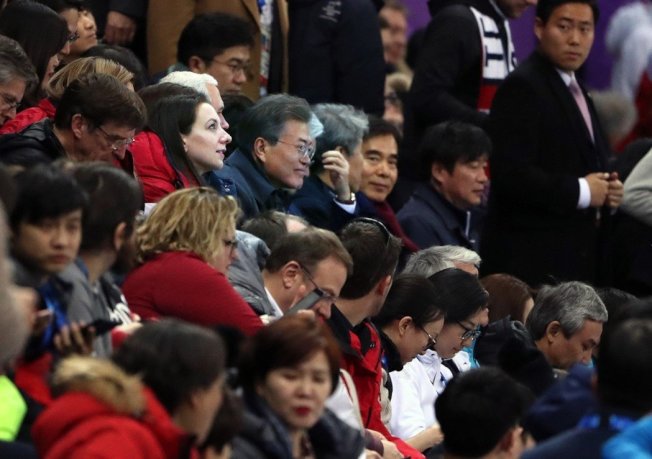 2月10日晚,韓國總統文在寅在江陵觀看冬奧會短道速滑比賽。 中新社