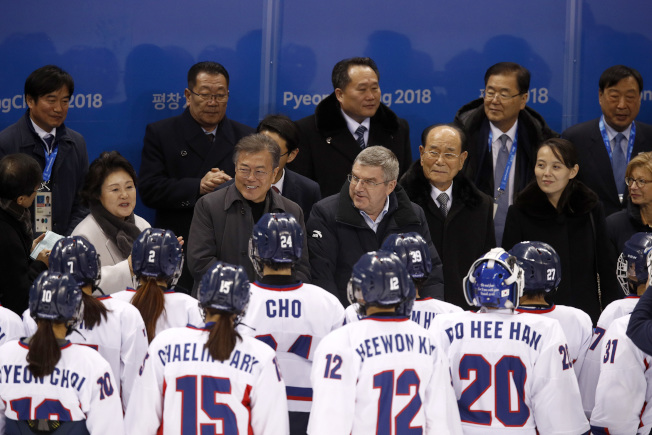 兩韓女子冰球聯隊出賽,南韓總統文在寅夫婦(中排左起)、國際奧會主席巴赫、北韓最高人民會議委員長金永南及金正恩胞妹金與正為她們打氣。(美聯社)