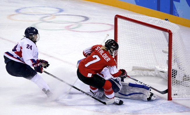 兩韓女子冰球聯隊首次出賽失利,圖為瑞士隊攻進一球。(Getty Images)