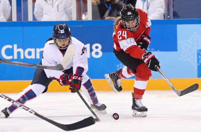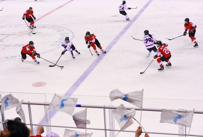 兩韓女子冰球聯隊(白色球衣)首次出賽,敗給瑞士隊。(Getty Images)