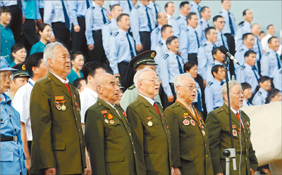 图为8月30日,河南郑州的抗战老兵、劳动模范等近4万群众参加“炎黄儿女在黄河岸边万人齐唱保卫黄河”活动。 冯大鹏摄(新华社发)