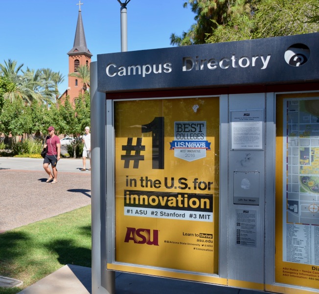 亞利桑納州立大學(ASU)獲評美國最具創新力大學,校園內竪起文宣標牌。(記者丁曙/攝影)