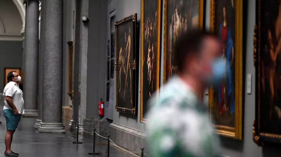 存档图片:西班牙首都马德里博物馆中两名戴口罩的参观游客 摄于2020年6月6日 Image d'archive: Deux hommes masqués visitent le musée du Prado, à Madrid, en Espagne, le jour de la réouverture du célébre musée, le 6 juin 2020. © GABRIEL BOUYS / AFP 法新社