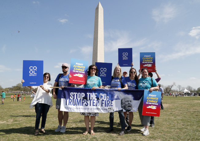華府遊行者站在華盛頓紀念碑前,要求美國減碳。(美聯社)