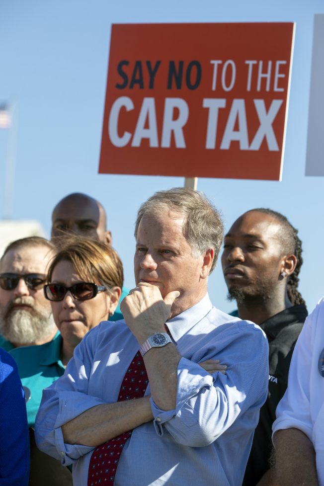 阿拉巴馬州聯邦參議員瓊斯19日與汽車工人在華府集會,抗議加徵汽車關稅。 (美聯社)