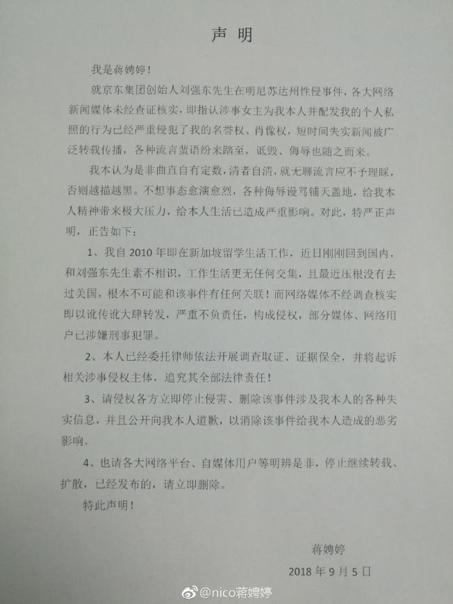 蔣娉婷5日在微博發文澄清,認為各大網路新聞媒體未經查證核實,即指認涉事女主角為她本人並配發她的照片,行為已經嚴重侵犯了她的名譽權、肖像權。