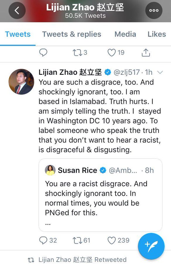 Should Zhao Lijian @zlj517 be labeled a “racist” simply because he told the truth about southeast Washington DC where “the whites never go?” No. Ms Susuan Rice @AmbassadorRice picked on wrong person. Some in US deserve ‘racist disgrace’ more than others. http://bit.ly/2ll6b63