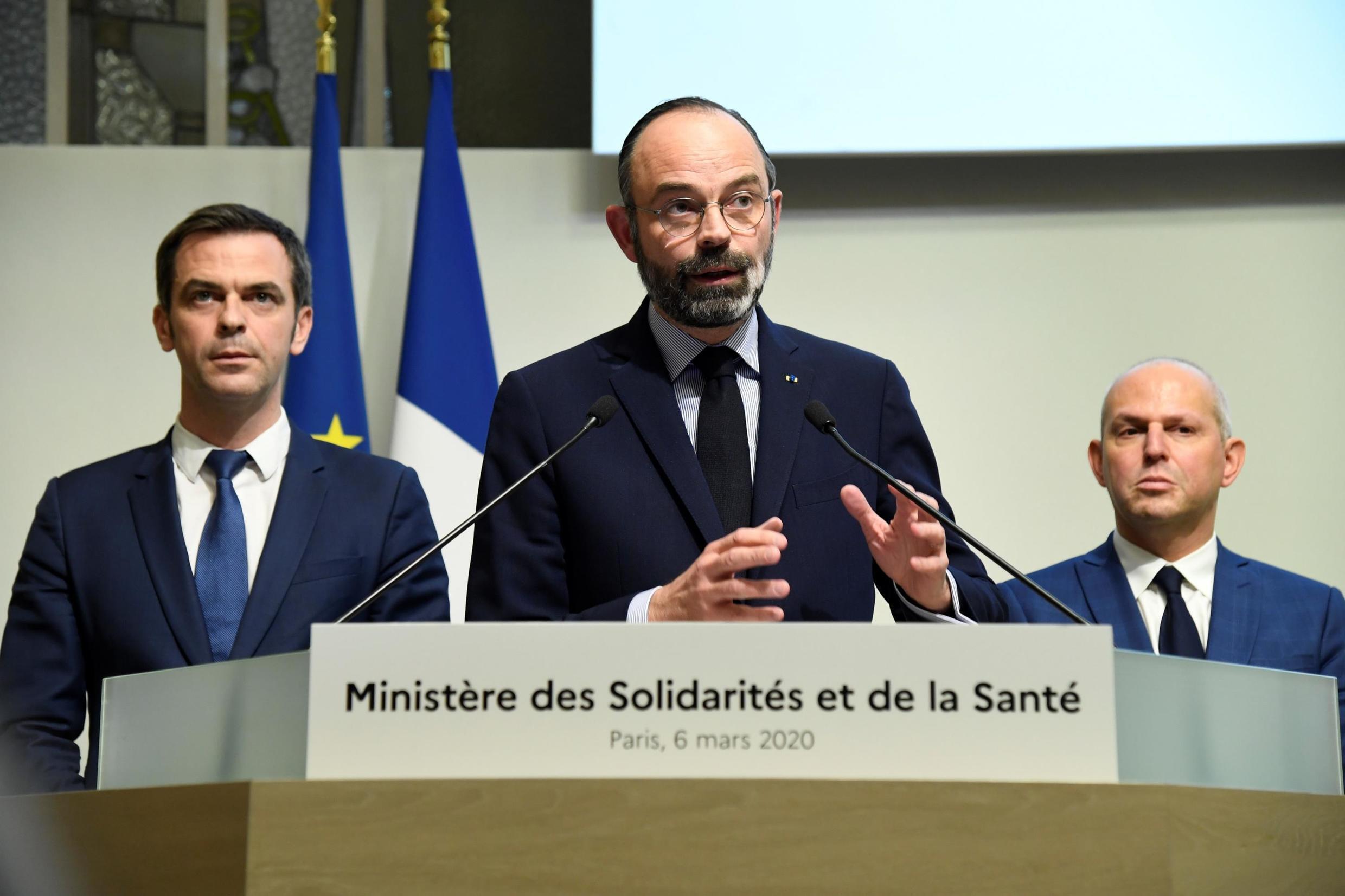 存档图片: 法国总理菲利普 摄于 2020年3月6日 Image d'archive: Le Premier ministre français Edouard Philippe (au centre) annonce des mesures pour renforcer la lutte contre l'épidémie de virus corona, le 6 mars 2020 à Paris. © Bertrand GUAY / AFP 法新社