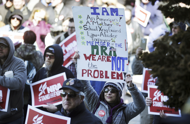 民眾在新澤西州首府翠登舉牌支持擁槍權利。(美聯社)