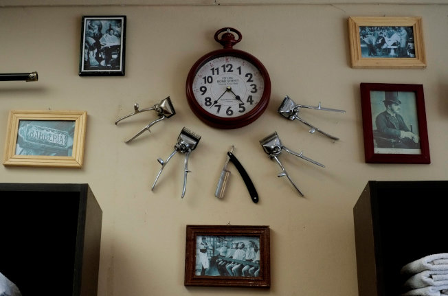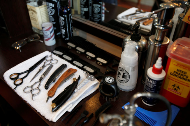 髮廊牆面上掛著許多復古剪髮用具。(路透)