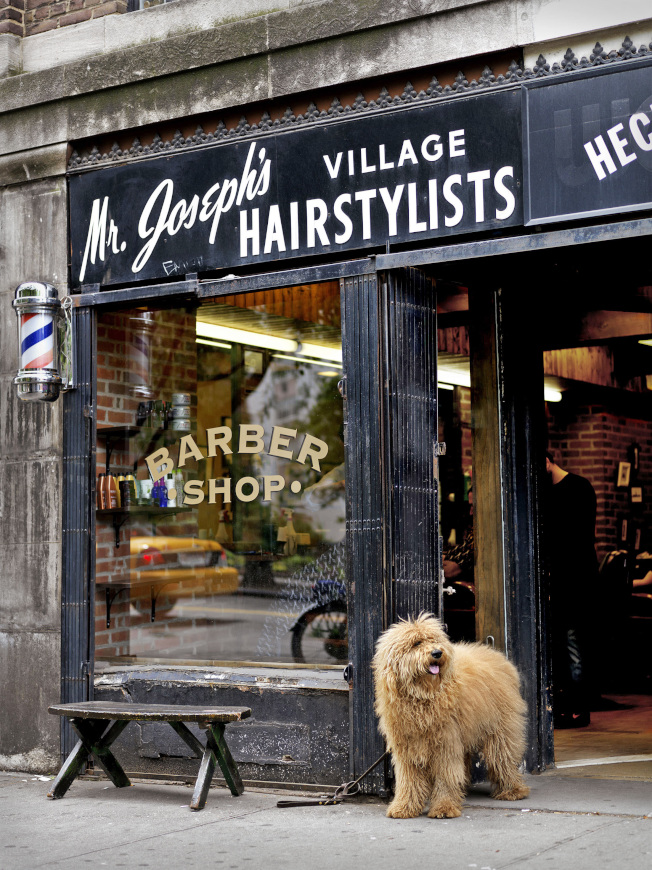 紐約曼哈頓西村一間髮廊與店狗。(美聯社)