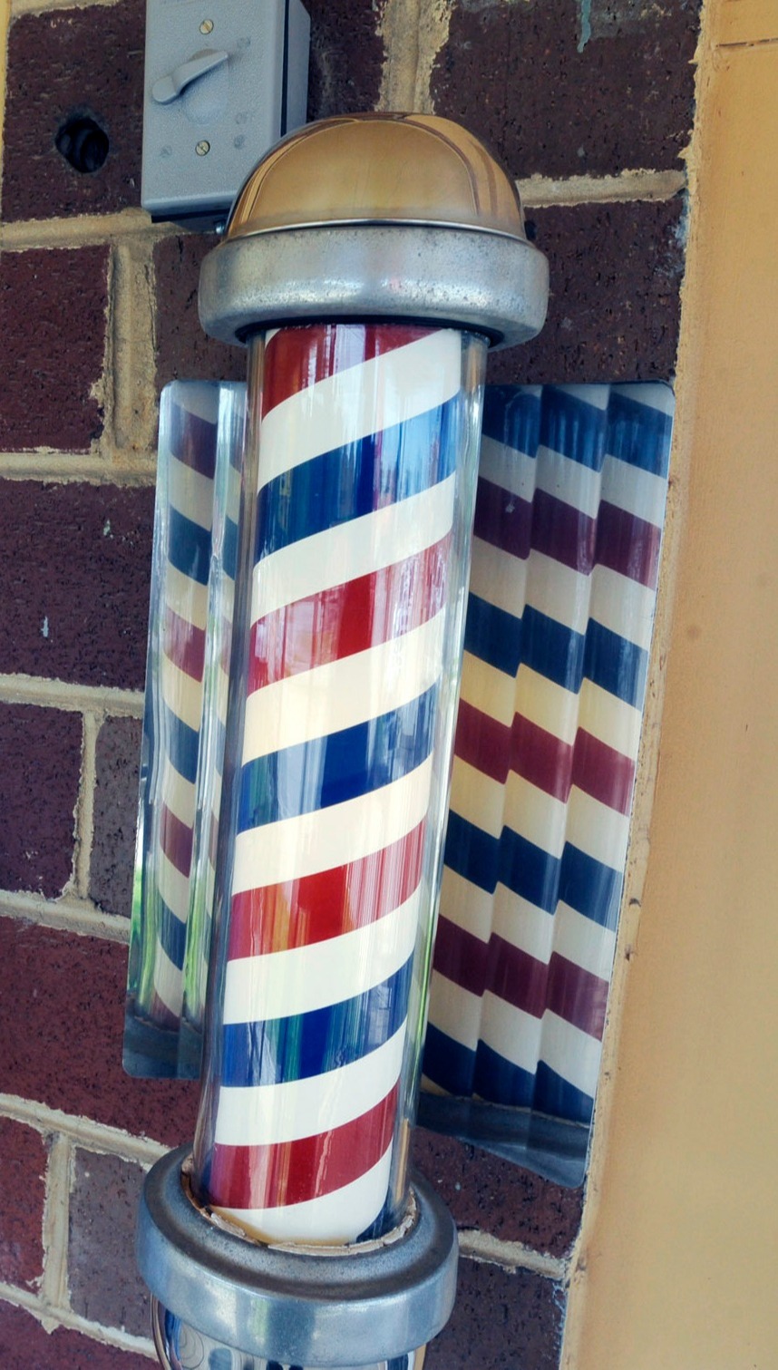 復古的紅白藍經典髮廊圓柱燈桿。(美聯社)