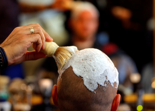髮型師在客人頭上塗抹刮鬍泡。(路透)