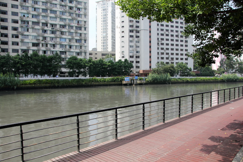 蘇州河畔,蘇州河有點像高雄愛河,也是有點臭味,據說當年楊惠敏就是游過這條河送國旗到四行倉庫,然而事實上她好像不是游泳過河,而是從橋上走過去。河的北岸為日軍佔領區,國軍只佔據了四行倉庫,而河的南岸則是外國租界,當時日軍顧慮外國勢力,不敢用海軍船炮攻擊四行倉庫,怕誤傷到蘇州河對岸的外國租界,因此四行倉庫才有機會死守下來。