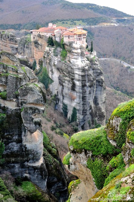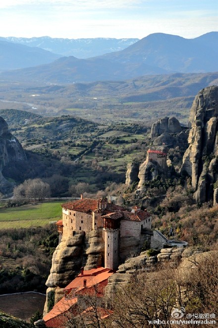 迈泰奥拉,位于希腊中部色萨利Thessaly西北边缘,靠近品都斯山脉, 这里奇特的石林地貌是由千万年前的地壳运动和随后的风华和腐蚀形成的拱顶岩层。由于这里独特的地形,高耸的岩石仿佛上天与地面间的桥梁,对于虔诚且需要冥想的修士来说,这里不仅是绝佳的修行地,也能很好阻隔侵略者的入侵。11世纪就已经有一些隐修士在天然洞穴里修行居住了,到了14世纪末,土耳其入侵希腊的情况日益严峻,罗马皇帝统治下的拜占庭日益衰落,很多修士为了远离战争来到了这个交通不便、奇石林立的迈泰奥拉,奇迹般地在山上修建了24座修道院,到现在仅存6座。他们无一例外都惊险地矗立在373米高度以上的悬崖岩石柱上,现在里面依然住着修士或修女。