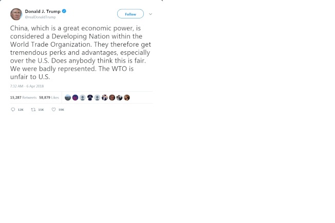 川普6日上午發布推文的矛頭,也指向世界貿易組織(WTO),他指出,中國是個經濟大國,在世界貿易組織(WTO)卻被視為發展中國家,因此他們獲得了許多優惠待遇與優勢,特別是從美國;川普直說,「WTO對美國不公平。」