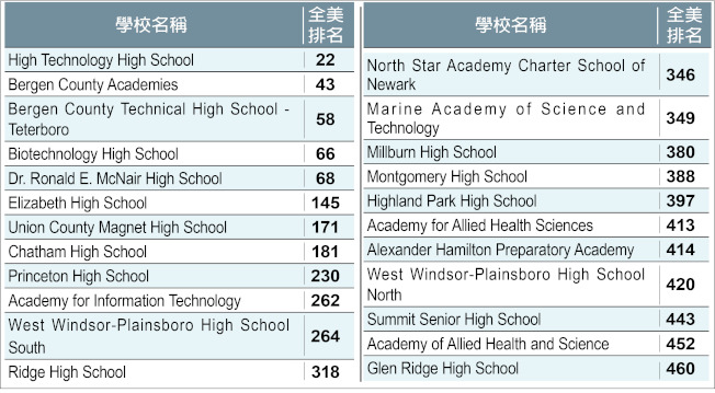 美國新聞與世界報導(U.S. News and World Report)9日公布全美最佳公立高中榜單,新州有五校進入前百、共23校獲得金牌,高科技高中(High Technology High School)排名全美22,位列新州第一。博根高中(Bergen County Academies)、博根技術高中(Bergen County Technical HS)分列二、三位。賓州以Downingtown STEM Academy,全美34名表現最佳;費城Julia R. Masterman Secondary School其次,第86名。德拉瓦州Charter School of Wilmington第119名。