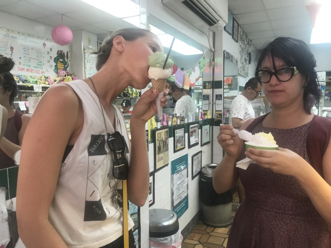 Gabriela Vie(左)選擇抹茶和荔枝口味冰淇淋,指出口味十分獨特。(記者牟蘭/攝影)