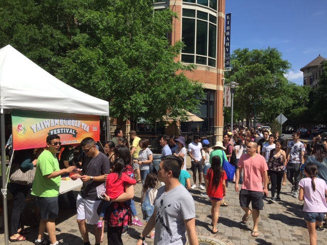 難得的豔陽天,洛市市中心的台灣珍奶園遊會上,珍珠奶茶各攤位前都排長龍。(記者王稚融/馬州報導)