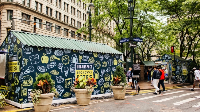 曼哈頓中城百老匯美食市集,位於百老匯大道交32街和33街之間的Greeley Square,即日起至6月15日,供民眾購買美食。(取自urbanspace instagram)
