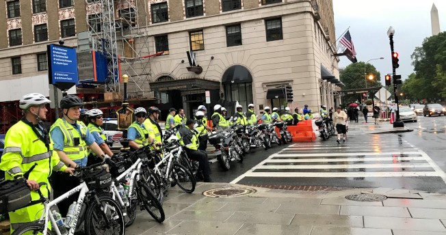 一場午後雷雨沖刷了華府種族對峙暴戾氣氛,維安警力仍在白宮旁不敢稍有鬆懈。(特派員許惠敏╱攝影)