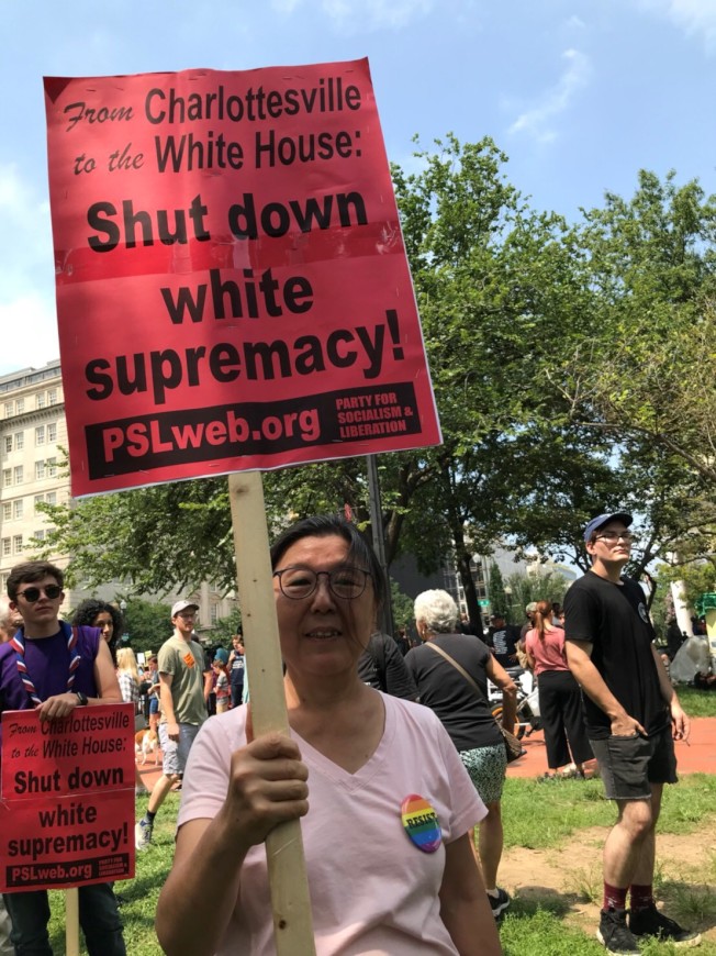 來自維州阿靈頓的韓裔沈女士和夫婿及朋友一起參加反右翼示威,她說,大華府是廣納新移民的包容城市,呼籲白人至上主義者別來興風作浪。(特派員許惠敏╱攝影)
