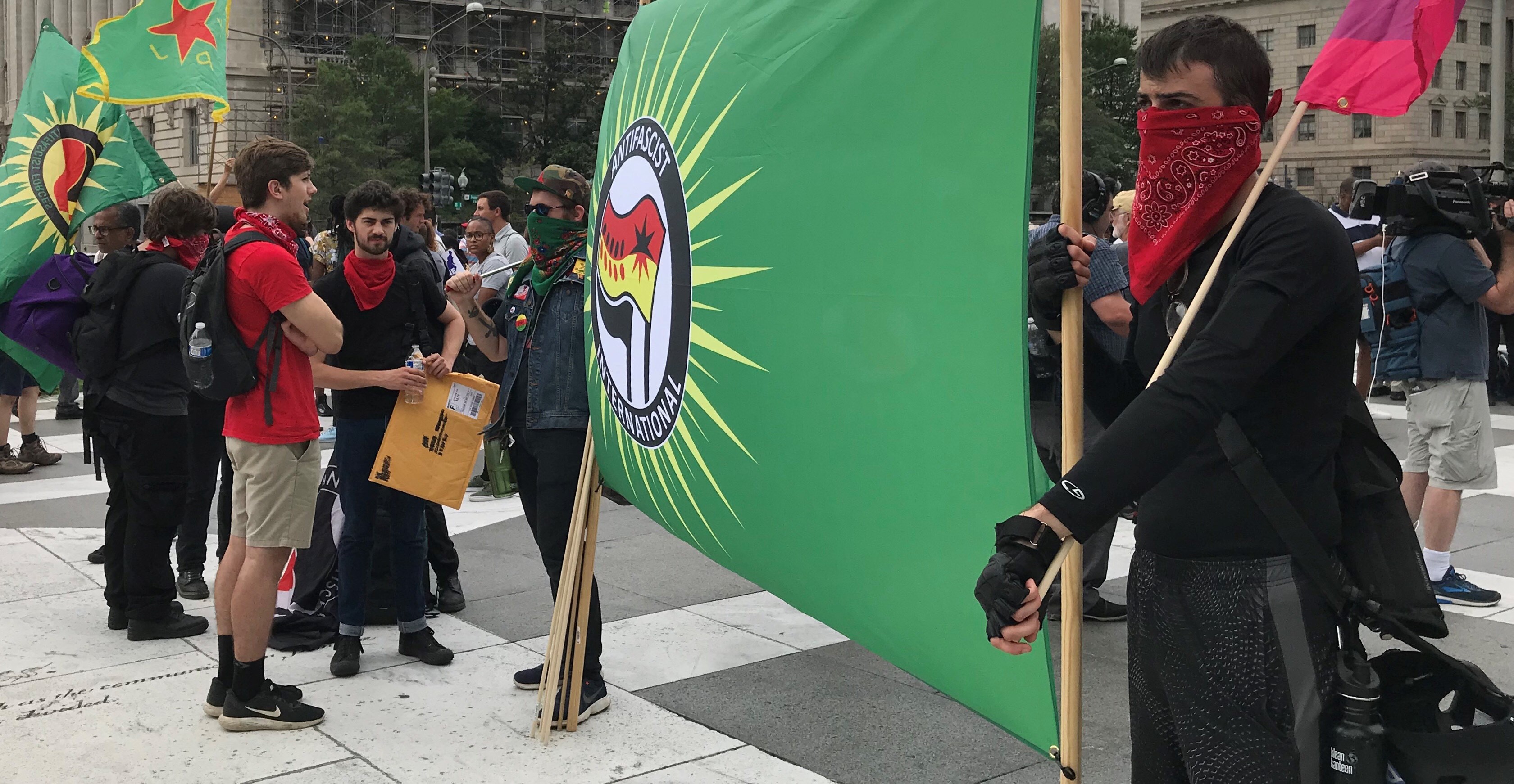 極端反種族主義組織Antifa,也戴蒙面頭巾大批出現在拉法葉廣場集會」。(特派員許惠敏/攝影)