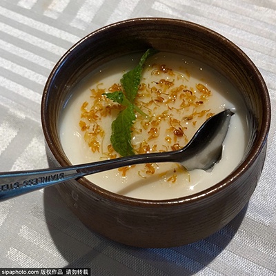 杏仁豆腐,大爱,上面撒的应该是巴旦木,杏仁豆腐口感有点像奶酪,杏仁味超浓,好吃极了。第一口感觉的是浓浓的奶味,第二口配上杏仁却有露露凝固的爽口味儿,第三口配上薄荷,却有奶香的纯和薄荷的爽混合而爆发出来的那种独特的清爽与浓厚共存的口感!