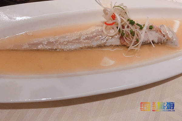 淮扬菜总体偏清淡,对食材的新鲜度要求极高。清蒸白鱼的鱼肉鲜美细嫩,笋干和腊肉很好地给鱼提味增鲜。爸爸告诉我一个辨别鱼是否是活鱼的办法,就是看做出来的鱼的眼睛是否白色往外凸。如果是白色往外凸,就说明鱼很新鲜。