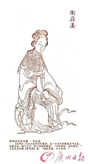 庄姜嫁到卫国的场面,具有轰动性的效果。《诗经》里有现场实录。齐国公主千里迢迢而来,累了,停下车队休息,姜大姑娘太显眼了,卫国围观的群众见了都说:瞧瞧,坐在路边休息的那位高大修长的俊俏妞,就是我们国君的媳妇,“硕人敖敖”。注意啦,这里强调的还是美女的高大,似乎周朝对于美女的标准暗合了当今的女超模标准,小巧秀气型的不太时兴。