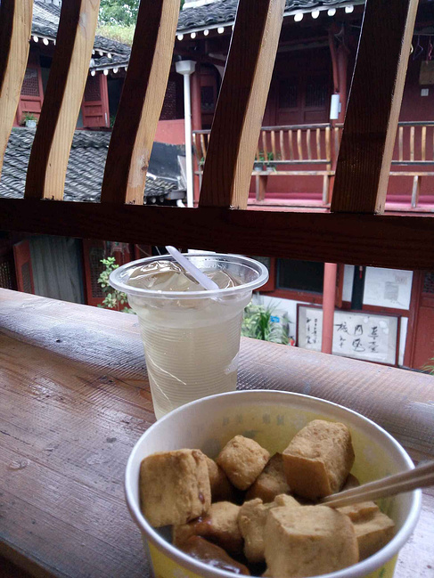 玩一天累了回旅社休息,可以先在门口老太臭豆腐买一份臭豆腐跟木莲冻,绍兴臭豆腐就不用说多好吃了,来了必须得尝尝的,木莲冻加了柠檬水,酸酸甜甜很可口~