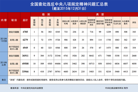 2015年12月,又有两名省部级官员因违反八项规定被处理。今晚,中纪委官网发布2015年12月全国查处违反中央八项规定精神问题汇总表,呈现出这一结果。